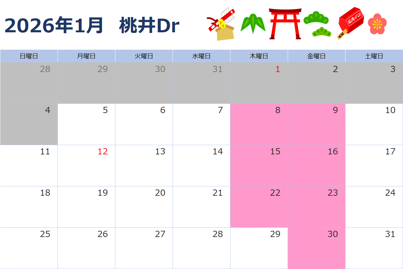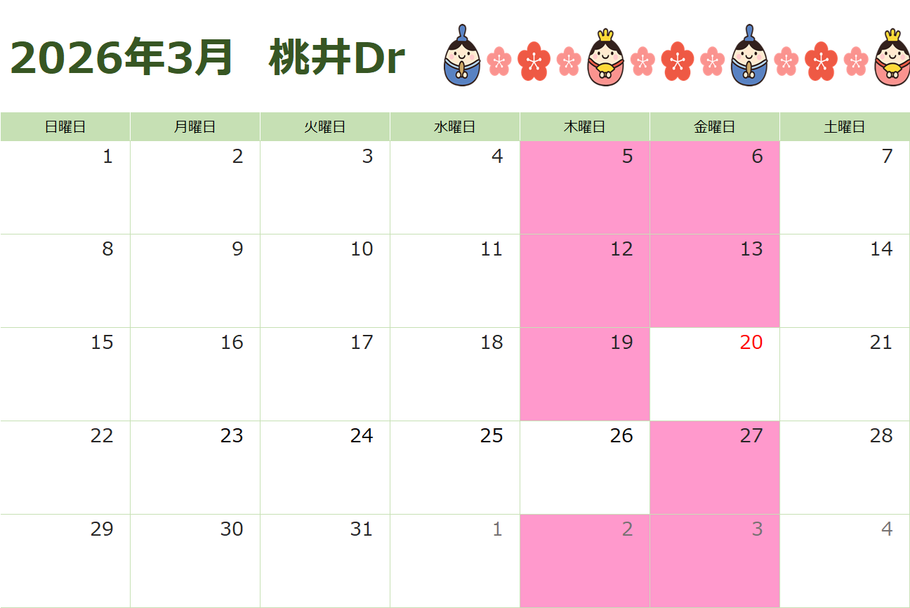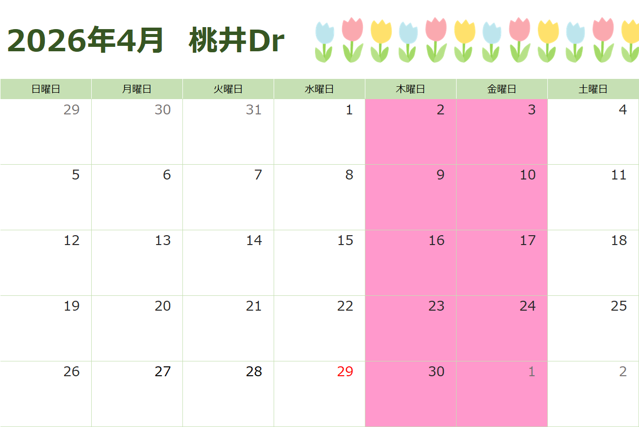 桃井先生の診察日は、下記カレンダーのピンク色の日付となります。