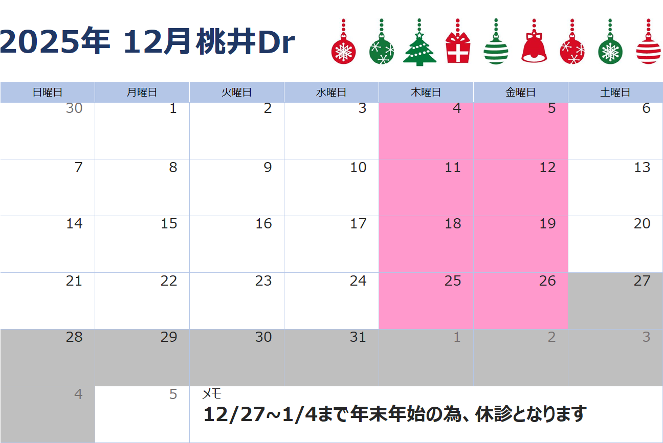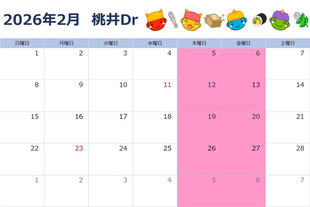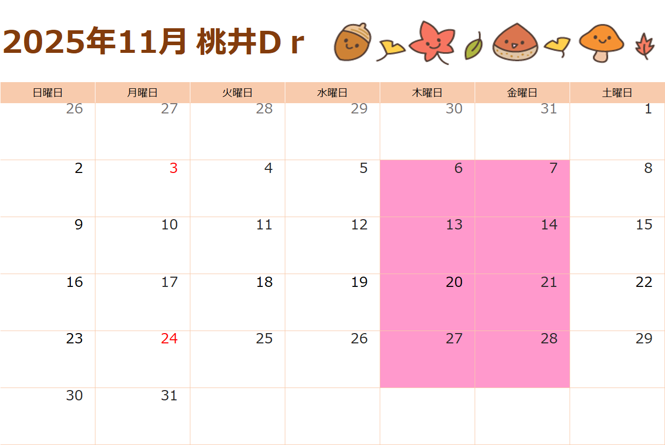 桃井先生の診察日は、下記カレンダーのピンク色の日付となります。