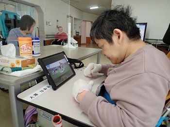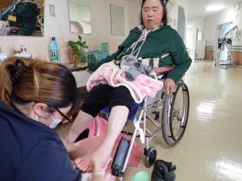 施設内で生活する利用者の方の日常的な様子です。足部のケアを行う利用者Kさん、毎日の楽しみであるコーヒーのお小遣いを係へ依頼する利用者Sさん、本日洗濯のまとめ洗いをする利用者Kさん、Youtubeを見ながら踊りの練習をする利用者Oさん、それぞれの日課をこなしております。
