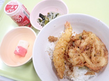 「天丼、酢の物、ジョアストロベリー味、お祝い和菓子」