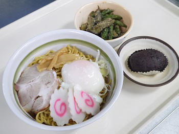 8月15日、今年のお盆メニューは新メニューの「まぜそば」を提供しました。初挑戦でしたが、利用者の皆さんどうだったでしょうか?他に、なすの胡麻和え、おはぎがつきました。