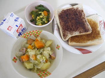 9月4日の特別献立はフレーバーパンでした。給食でおなじみの“ミルメーク”を食パンにかけたもので、「ココア」と「キャラメル」の2種類の味を提供しました🐄他には牛乳、ポトフ、コーンサラダがつきました。
