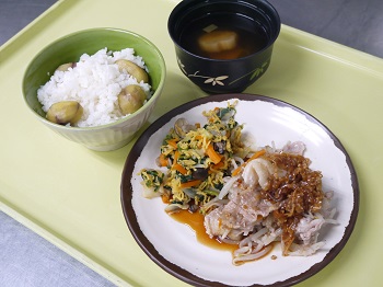9月9日は重陽の節句として「栗ご飯」を提供しました。重陽の節句は、邪気を払い、不老長寿を願う日とされ、栗や茄子料理を食べてお祝いされています🌰他に、清汁、豚肉の香味焼、五色和えがつきました。