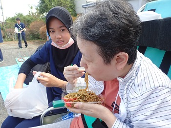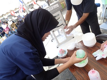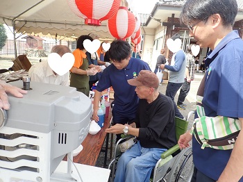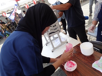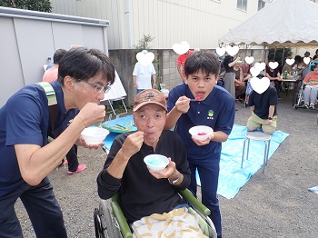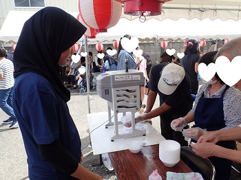 到着後は地区会長Y様に挨拶を済ませ、模擬店の焼きそば、焼き鳥、フランクフルト、枝豆、飲み物、かき氷を飲食しました。