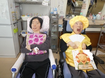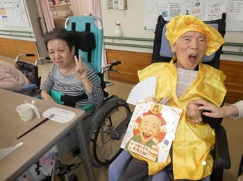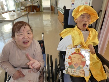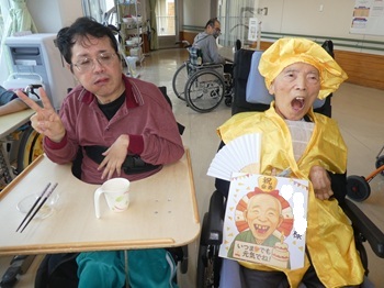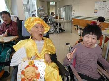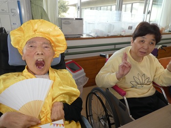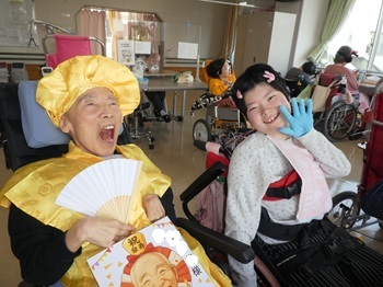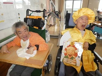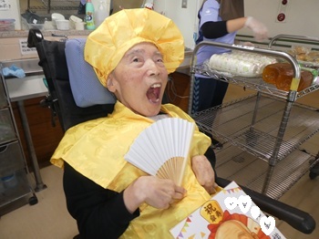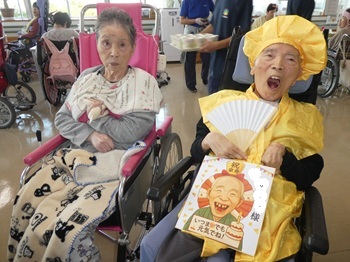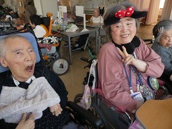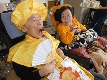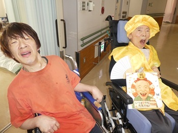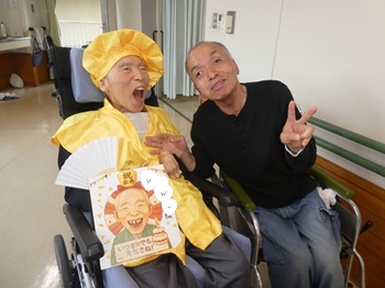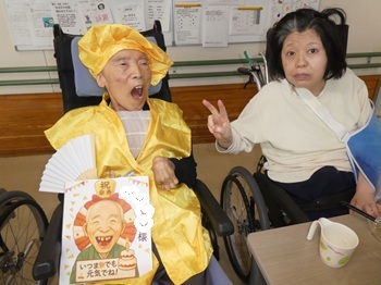 利用者のTさんは桐花園で最高齢の利用者さんです。いつも元気に声を出して、介助を依頼します。話しかけられることと、女性のことが好きで、話しかけられると顎が外れてしまいそうな笑顔を見せてくれます。今日は主役で、たくさんの利用者さんと写真を撮り、どれも大きく口を開いて、笑ってくれました。これからも元気な声で呼んでくださいね。