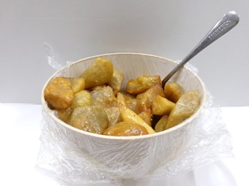 本日のティータイムは大学芋と緑茶でした。傘寿のお祝いに気をとられてしまい、大学芋を食する皆さんの様子を撮り忘れてしまいました。大学芋だけは撮らせていただきます。(写真の大学芋は一人分ではありません。)