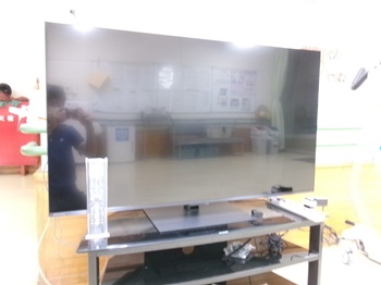 今年の最新モデルのスマートTVを頂ました。1階のロビーに設置させていただきました。すべてが反射されてしまうほどピカピカです。今までのテレビも薄型でしたが、さらに薄型で、画面サイズはサイズアップさせていただきました。この場を借りて、保護者の皆様に感謝を申し上げます。ありがとうございました。