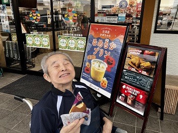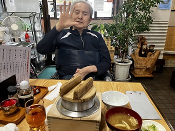 10月22日、Fさんが金釜 広沢店に行って来ました。 今年2度目の金釜です。とても楽しみにしていて早々に玄関で待っていました。釜めしと茶碗蒸しのセットを頼み、支援員にも「うまいから食べてみて。」と言っていました。その後はさくらみくらに移動し、本人が選んだどら焼きとカフェオレを飲食しました。