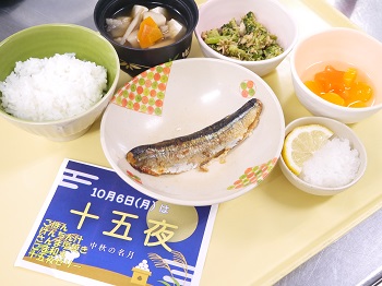 10月6日は十五夜で、米飯・けんちん汁・さんま塩焼き・胡麻和え・十五夜ゼリー のお月見メニューでした。