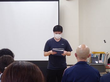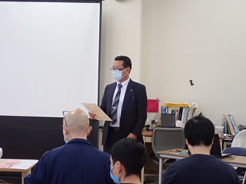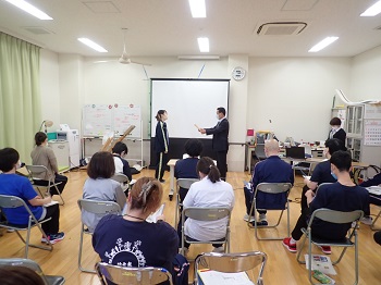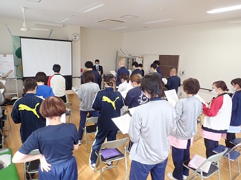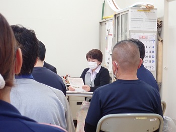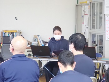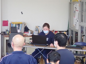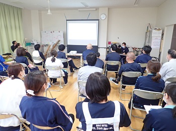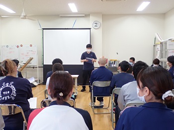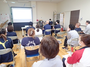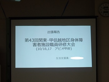 11月の行事予定確認、各種委員会報告、支援課サブリーダーのYさんからは接遇目標の発表、倫理綱領等の唱和などを行い、研修に行った方から研修報告がありました。