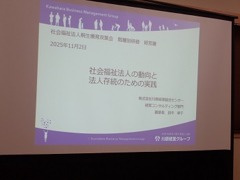 研修の内容は、「社会福祉法人の動向と法人存続のための実践」として