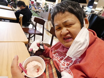 Oさんは到着すると楽しそうに『バスタオルとトレーナーを買うんです。』とのことで購入し、フードコートで烏龍茶とアイスを飲食しました。車の中では“可愛いだけじゃダメですか”のアレンジバージョンを歌って盛り上がっていました。