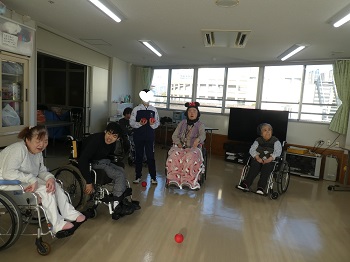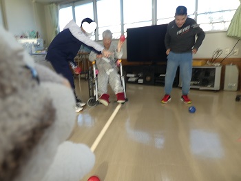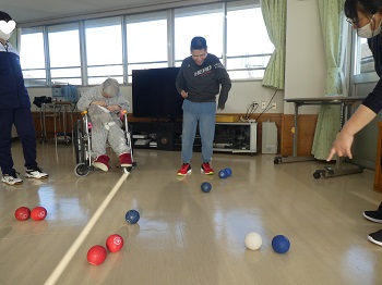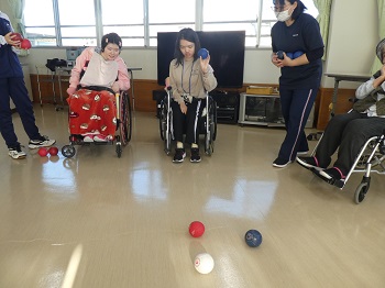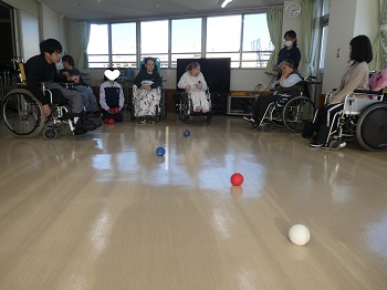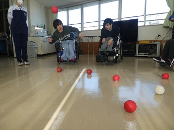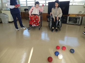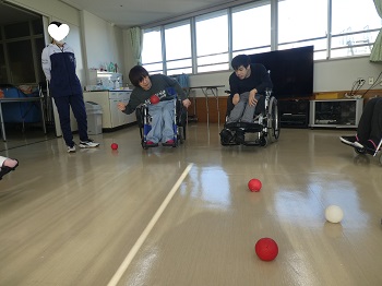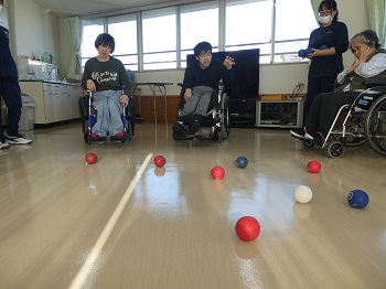 今週は介護等体験の学生さんが2名来てくれていたので、ボッチャのお手伝いをしてもらいました。
