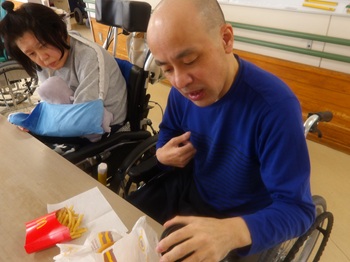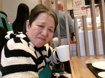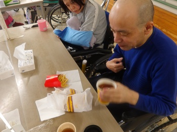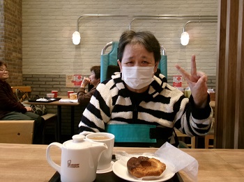 ドーナッツを食べながら隣の席の支援員の顔を見て『今日はラッキーだね。』と笑顔で言っていました。