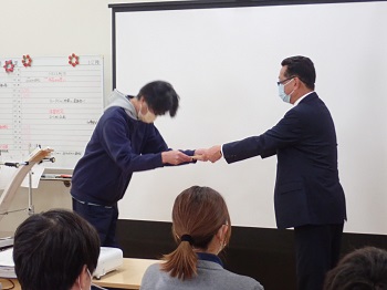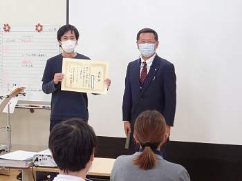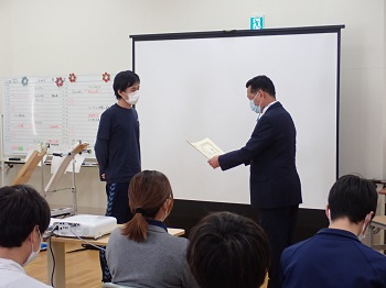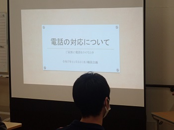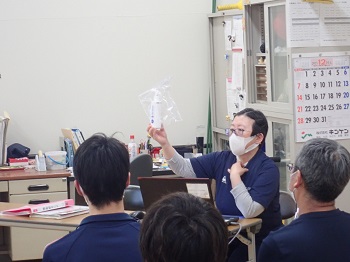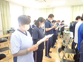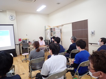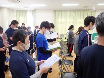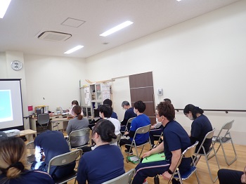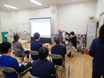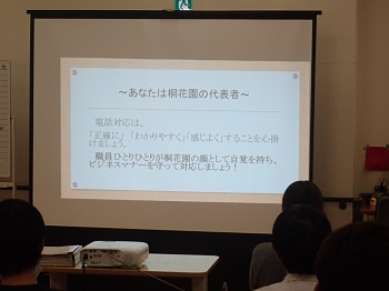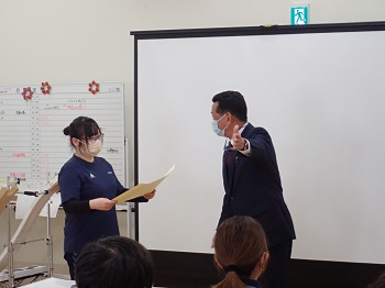 職員会議内では新入職員のMさんによる挨拶が行われ、とても丁寧な自己紹介をして頂きました。新潟出身で以前も福祉の業界に従事していたとの事です。その後、勤続20年、15年、10年の表彰がされました。皆さん現場で中心的に活躍して頂いている職員です。表彰の後は委員会の報告を各職員よりして頂き、今回は看護知識研修を開催いたしました。研修では、利用者の状況に合わせた求められる支援をテーマに、参加している職員には共通理解を図りました。その後、事務長による電話のかけ方研修が開催されました。外部へのやり取りは1対1の顔が見えないやり取りであり、声色だけで印象が伝わります。職員一同がひとつひとつの電話対応では施設の代表であるという認識をもってもらえることを期待しています。
