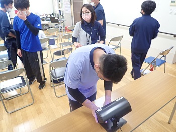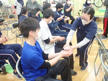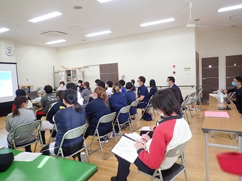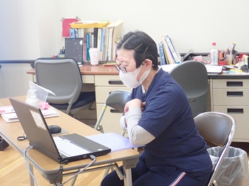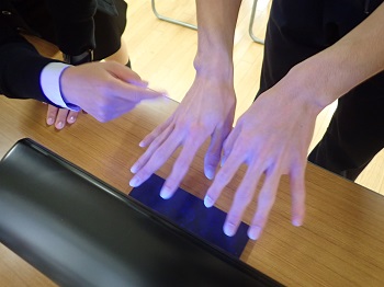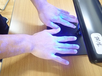 BCP研修は年2回の義務研修となっており、全職員を対象に本日が2回目の研修となりました。内容はクラスターにならない為の防止策と意識を持つこと、日々できる事は実施しておく事など動画にて学習し、その後手洗いの研修を実施しました。ブラックライトに反応するハンドクリームをしっかりと擦り込み、一度ブラックライトに当ててどれ程付着したのかを確認し、その後しっかりと石鹼で各自手洗いを行ってもらいました。再度ブラックライトに手をかざすとどれほど落とすことが出来たのかが確認出来る内容となっていましたが、感染症委員会の思惑通り、職員の皆さん洗った後の手のクリームはほとんど落ちていない結果となりました。とてもよく洗っていたとしても、指先があまり洗えていなかったり、手の甲や手首が洗えていないという現実に、皆さん驚きを隠せていませんでした。洗い終わりには、皆さん手がカピカピに乾燥していました。