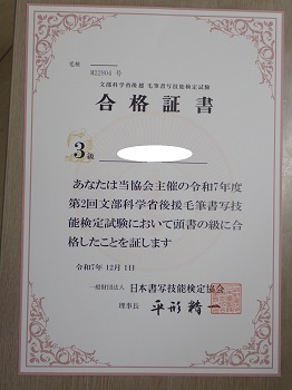 Tさん、第2回文部科学省後援毛筆書写技能検定試験3級、無事合格しました!!