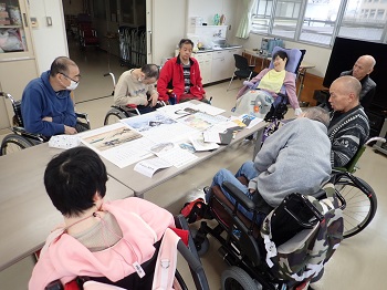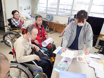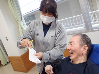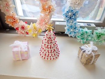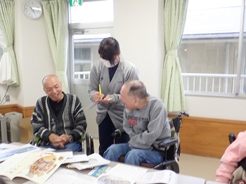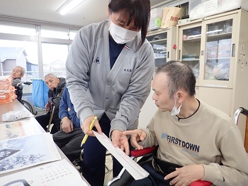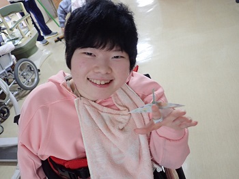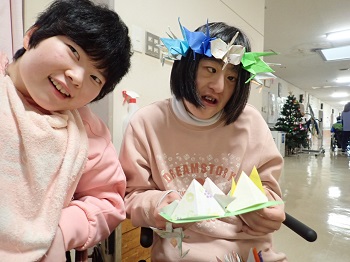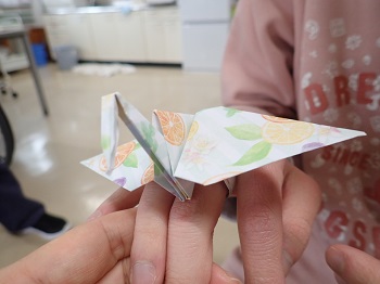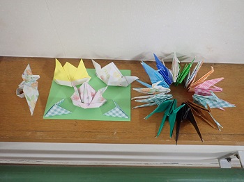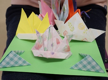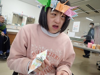 ショートステイで来園しているFさん、折り紙が好きでよく鶴を折っています。