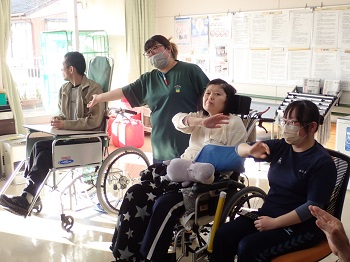 先日、1階のロビーで数人の利用者さんと支援員のTさん、Nさんが推し活をしていました。