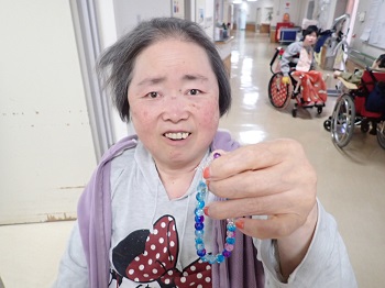 起床後、食堂に来る際にKさんが「これ作ったんだよ。あげるよ。」とビーズのブレスレットをプレゼントしてくれました。