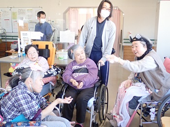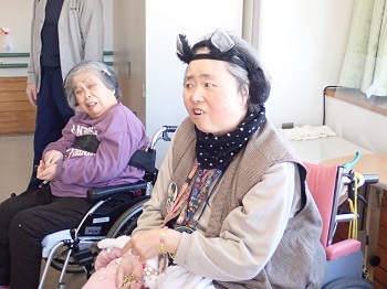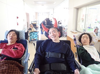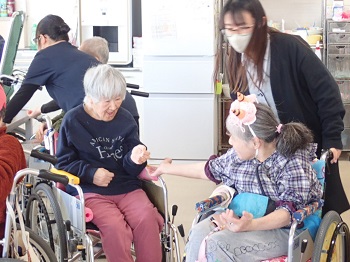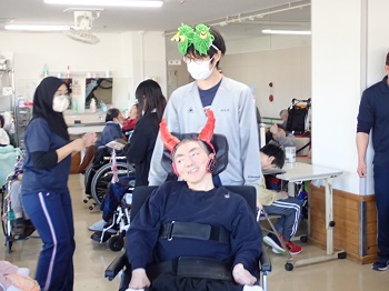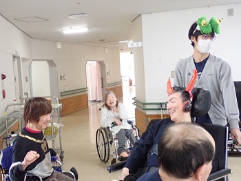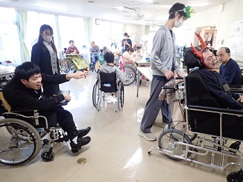 今年の年男、年女が鬼役になり、1階、2階ともみんなで鬼に向かって豆をぶつけ、施設内から追い出しました。