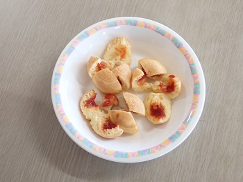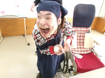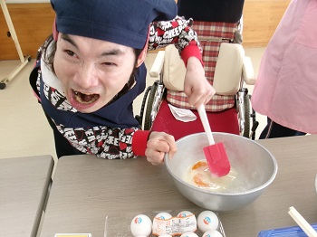 作業中、何人かの支援員が代わる代わる様子を見に来てくれて手伝ってくれましたが、支援員が焼けたかどうかを見ようとホットケーキを裏返そうとすると、『まだダメ。』と言わんばかりに手を出し静止させて笑いを誘っていました。