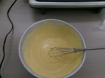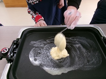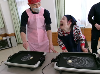 Mさんには生地を混ぜたりプレートに生地を垂らしたり出来る作業を行ってもらい、難しい部分は支援員が介助をしました。