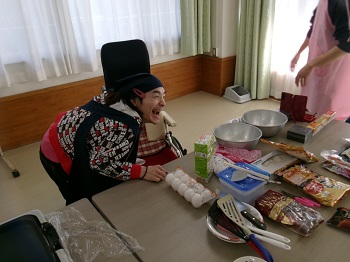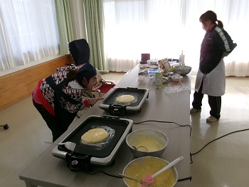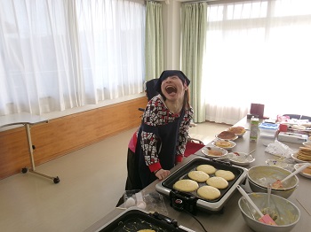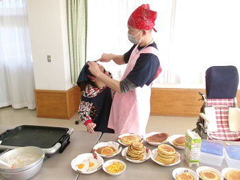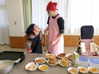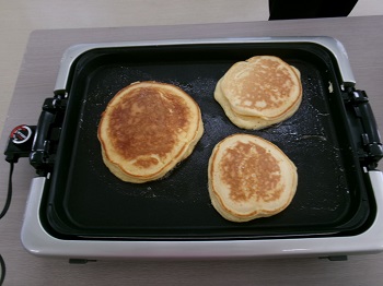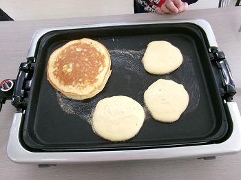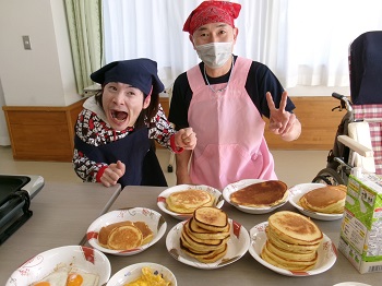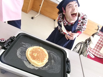 2月4日(水)利用者Mさん、担当支援員のIさんが13:30~15:00 創作活動室でホットケーキ作りを行っていました。