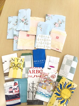 キレイな包装紙やカラフルで個性がある紙袋を使い、どの柄にしようか考えたり、どこの部分を使って仕上げようかと考えながら取り組みました。