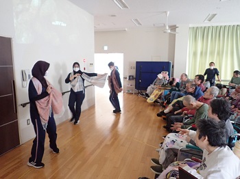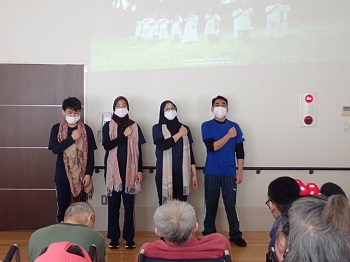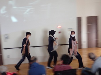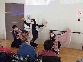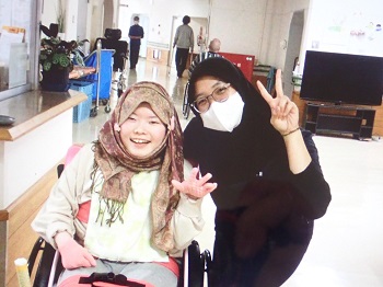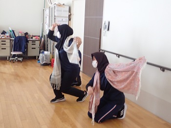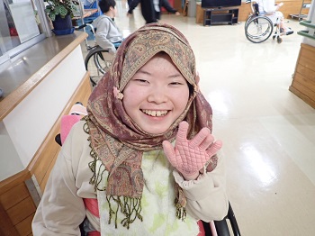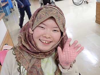 日中活動終了後、Kさんは「私も前に出て一緒に踊りたかった♪」と言っていましたが、スカーフをヒジャブのように巻いてもらい、みんなから「似合う~可愛い!」と言われていました。