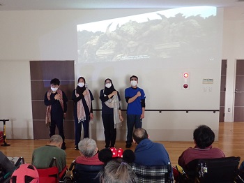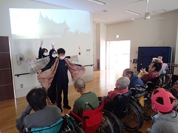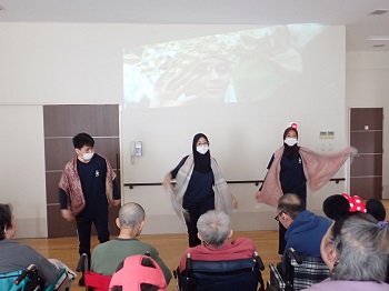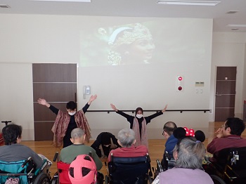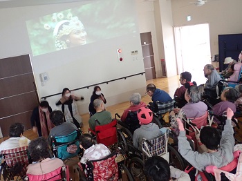 リハビリ室の壁にインドネシアの映像を映し出し、「Wandrelandインドネシア」の踊りと歌を鑑賞しました。
