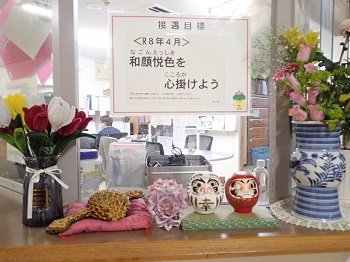 四月の接遇目標は <和顔悦色(なごんえつしき)を心掛けましょう。>です。